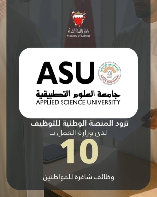 في إطار تنفيذ توجيهات صاحب السمو الملكي الأمير سلمان بن حمد آل خليفة ولي العهد رئيس مجلس الوزراء حفظه الله، بعرض 3 فرص وظيفية لكل باحث عن عمل مسجل لدى وزارة العمل، جامعة العلوم التطبيقية تزود المنصة الوطنية للتوظيف بـ 10 وظائف شاغرة للمواطنين.