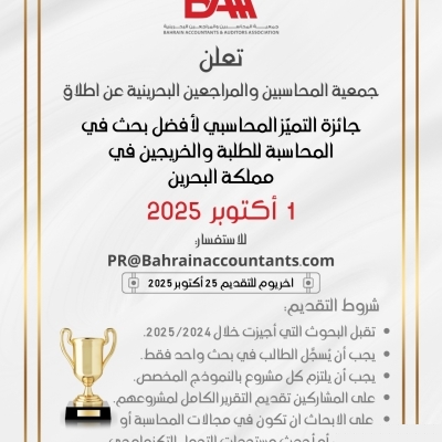 تعلن جمعية المحاسبين والمراجعين البحرينية عن إطلاق «جائزة التميّز المحاسبي» في الأول من أكتوبر 2025، وذلك في إطار سعيها المستمر للنهوض بمهنة المحاسبة وتعزيز دورها في خدمة الاقتصاد الوطني.