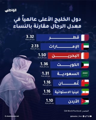 أما قطر فاحتلت المرتبة الأولى على مستوى العالم بمعدل 3.32 رجل لكل امرأة، وهو الأعلى عالمياً على الإطلاق. هذه النسبة الكبيرة ترتبط بطبيعة الاقتصاد القطري المعتمد على مشروعات البنية التحتية والطاقة التي تجذب أعداداً ضخمة من العمالة الأجنبية الذكورية.