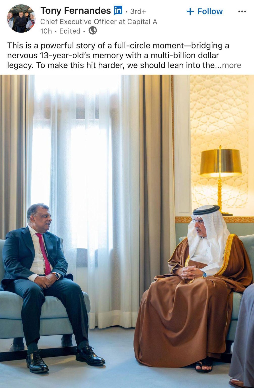 أشاد توني فرنانديز الرئيس التنفيذي لشركة Capital A المالكة لشركة “إير آسيا” بالدور القيادي لمملكة البحرين في ترسيخ بيئة اقتصادية جاذبة تقوم على الرؤية الواضحة وروح الفريق الواحد، مؤكدًا أن ما يميز المملكة لا يقتصر على السياسات، بل يتجسد في الإيمان العميق بالمسؤولية الوطنية والعمل بروح الانتماء.