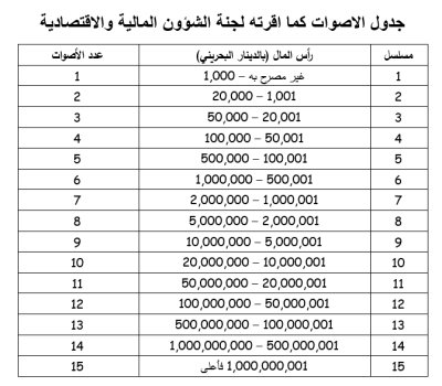وطبقاً للمشروع كما أقرته لجنة الشؤون المالية والاقتصادية ستتراوح الأصوات من صوت واحد للشركات متناهية الصغر إلى 15 صوتاً للشركات التي تتجاوز مليار دينار، في حين أن القانون النافذ ينص على أن تتراوح الأصوات من صوتين ولغاية 256 صوتاً، وذلك للشركات التي يتجاوز رأس مالها 5 ملايين دينار.