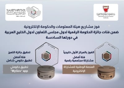 فازت مشاريع رقمية مقدمة من مملكة البحرين ضمن فئات جائزة الحكومة الرقمية لدول مجلس التعاون لدول الخليج العربية، إذ حصدت المنصة الوطنية المطوّرة للمشاركة الإلكترونية المقدمة من هيئة المعلومات والحكومة الإلكترونية (bahrain.bh/sharekna) على المركز الأول في فئة أفضل منصة للمشاركة الرقمية خليجيًا، وحقق تطبيق حكومتي (MyGov app) المقدم من الهيئة جائزة التميز في فئة (أفضل تطبيق حكومي شامل)، كما فازت اللعبة الرقمية (حارس الفضاء السيبراني) المقدمة من المركز الوطني للأمن السيبراني بالمركز الأول خليجيًا في فئة (أفضل لعبة رقمية هادفة)، وذلك خلال حفل تكريم الفائزين بالجائزة الذي تستضيفه دولة الكويت الشقيقة بالتعاون مع الأمانة العامة لمجلس التعاون لدول الخليج العربية.