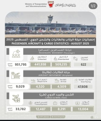 كشفت إحصائيات وزارة المواصلات والاتصالات لشهر أغسطس 2025 عن تسجيل ارتفاع ملحوظ في حركة الركاب والطائرات والشحن الجوي عبر مطار البحرين الدولي، حيث بلغ إجمالي عدد المسافرين خلال الشهر 951,795 مسافر، منهم 509,235 قادم و441,938 مغادر، إضافة إلى 622 مسافراً عابراً.