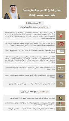 بعد ذلك أكد مجلس الوزراء مواصلة مسارات التطور الاقتصادي بما يرفد المسيرة التنموية الشاملة بقيادة حضرة صاحب الجلالة ملك البلاد المعظم حفظه الله ورعاه والتي عكستها ما استعرضه مجلس التنمية الاقتصادية في اجتماعه الذي عقد برئاسة صاحب السمو الملكي ولي العهد رئيس مجلس الوزراء حفظه الله حول نتائج الـ9 شهور الأولى من 2025 والتي أظهرت النجاح في استقطاب استثمارات مباشرة بقيمة 1.52 مليار دولار من 75 مشروعًا محليًا ودوليًا ستسهم في خلق أكثر من 4300 فرصة عمل جديدة خلال ثلاث سنوات.