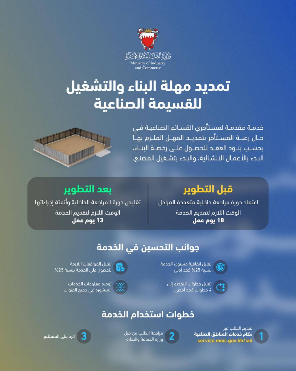 في إطار الجهود الحكومية لتطوير جودة الخدمات وإعادة هندستها، طوّرت وزارة الصناعة والتجارة خدمة تمديد مهلة البناء والتشغيل للقسيمة الصناعية، وتتيح هذه الخدمة لمستأجري القسائم الصناعية التقدم بطلب تمديد المهل الزمنية الة ببنود العقد، بما يشمل المدد اللازمة للحصول على رخصة البناء، والبدء بالأعمال الإنشائية، والشروع في تشغيل المصنع، وفق الضوابط المعتمدة، وذلك ضمن مساعيها المستمرة للارتقاء بمستوى الخدمات المقدمة وتعزيز كفاءة الإجراءات.