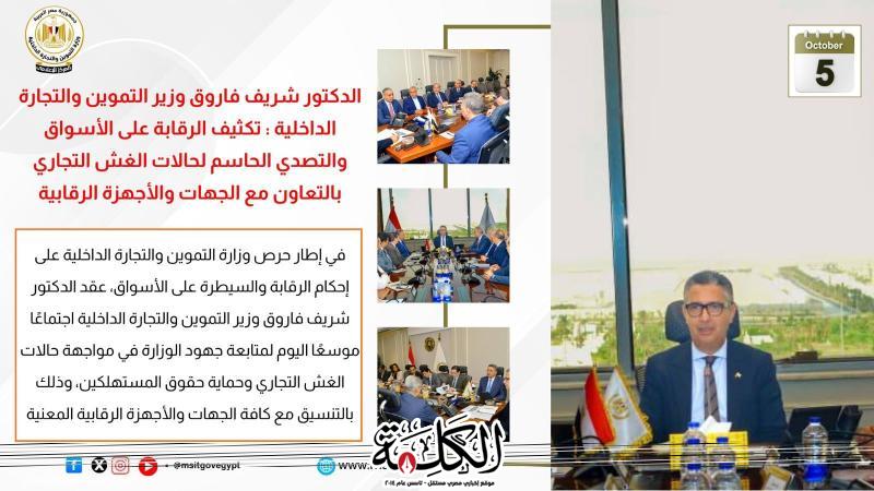 عقد الدكتور شريف فاروق وزير التموين والتجارة الداخلية اجتماعًا موسعًا مع رئيس جهاز حماية المستهلك ومدير الإدارة العامة لشرطة التموين والتجارة الداخلية وقيادات الوزارة، حيث أكد على تكثيف حملات الرقابة على الأسواق والتصدي الحاسم لممارسات الغش التجاري بالتعاون مع الأجهزة الرقابية، بما يضمن استقرار المنظومة السوقية وحماية المواطنين.