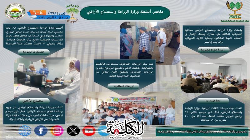 ونفذ معهد بحوث الإرشاد الزراعي والتنمية الريفية، التابع لمركز البحوث الزراعية، حزمة من الأنشطة خلال شهر سبتمبر الماضي، شملت 17 ورشة عمل و 382 ندوة إرشادية وحلقة نقاشية بهدف دعم المزارعين والأسر الريفية وتنمية مهارات العاملين بالقطاع الزراعي، كما أعلن قطاع تنمية الثروة الحيوانية والداجنة عن إصدار نحو 1049 ترخيص تشغيل ما بين تجديد وأول مرة لكافة أنشطة ومشروعات الثروة الحيوانية والعلفيه والداجنة ومراكز تجميع الألبان، بينما أطلقت وزارة الزراعة واستصلاح الأراضي، ممثلة في الهيئة العامة للإصلاح الزراعي، 7 منافذ متحركة محملة بكميات كبيرة من بيض المائدة لبيعه بسعر 145 جنيه للمواطنين، للمساهمة في رفع العبء عن كاهلهم.