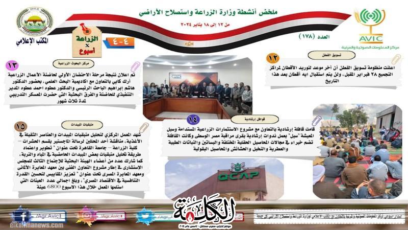 أصدر مركز المعلومات الصوتية والمرئية، التابع لوزارة الزراعة واستصلاح الاراضي، “الانفوجراف الاسبوعي” في نسخته رقم ١٧٨ ، حول الحصاد الاسبوعي لأهم أنشطة الوزارة، خلال الاسبوع الماضي في الفترة من ١٢ وحتى ١٨ يناير الجاري، وذلك بالتعاون مع المكتب الاعلامي للوزارة، كما أصدر المركز ايضا ملخصا بالفيديو، حول انشطة الوزارة خلال نفس الفترة.