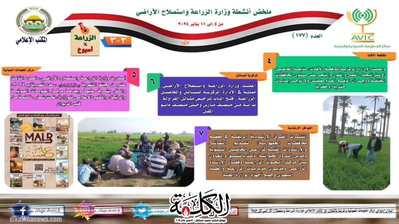 أصدر مركز المعلومات الصوتية والمرئية، التابع لوزارة الزراعة واستصلاح الاراضي، “الانفوجراف الاسبوعي” في نسخته رقم ١٧٧ ، حول الحصاد الاسبوعي لأهم أنشطة الوزارة، خلال الاسبوع الماضي في الفترة من ٥ وحتى ١١ يناير الجاري، وذلك بالتعاون مع المكتب الاعلامي للوزارة، كما أصدر المركز ايضا ملخصا بالفيديو، حول انشطة الوزارة خلال نفس الفترة.