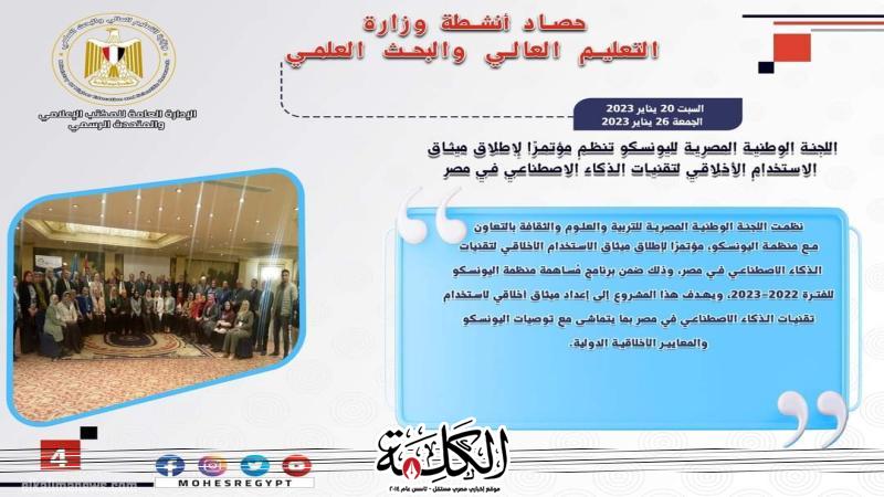 4) نظمت اللجنة الوطنية المصرية للتربية والعلوم والثقافة بالتعاون مع منظمة اليونسكو، مؤتمرًا لإطلاق ميثاق الاستخدام الأخلاقي لتقنيات الذكاء الاصطناعي في مصر، وذلك ضمن برنامج مُساهمة منظمة اليونسكو للفترة 20222023، ويهدف هذا المشروع إلى إعداد ميثاق أخلاقي لاستخدام تقنيات الذكاء الاصطناعي في مصر بما يتماشى مع توصيات اليونسكو والمعايير الأخلاقية الدولية.