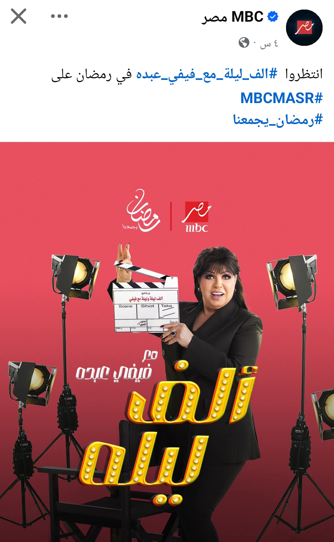 ونشرت الصفحة الرسمية لقناة mbc مصر، صورة بوستر برنامج فيفي عبده، على موقع التواصل الاجتماعي فيسبوك.