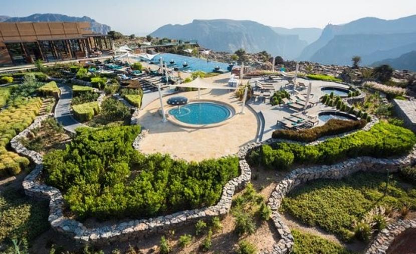 من لحظة دخول الضيوف من المدخل المهيب تحيط بهم بيئة مريحة وعصرية، ويزداد الشعور بحرارة الوصول مع حفل الاستقبال حيث يمكنهم الاستمتاع بالنسيم المنعش والاستماع إلى الموسيقى العمانية التقليدية، وخلال المرور عبر الساحة المركزية يمكن للضيوف الاستمتاع بالمنظر الرائع الممتد على مد البصر عبر الحدائق الوارفة للمنتجع ومنها إلى الوادي السحيق. وبفضل الموقد الكبير المشتعل بنار هادئة تتحول الساحة المركزية إلى قلب المنتجع النابض. ويستمر التصميم الرائع للمنتجع مع وجود ستة مطاعم وقاعات، ومنها مطعم القلعة المتميز الموجود في برج مرتفع مستوحى من تصميم قلعة خصب التاريخية بولاية مسندم، شمال السلطنة. وهنالك العديد من الميزات الفريدة ومن ضمنها المنتجع الصحي بتصميمه المتميز بالقنوات المائية التي تشبه الأفلاج وفيها تجري المياه بهدوء في مختلف أنحاء المنتجع وصولاً إلى حوض السباحة ذو الأطراف الشفافة والذي يمتد على طول منحنى الجبل.