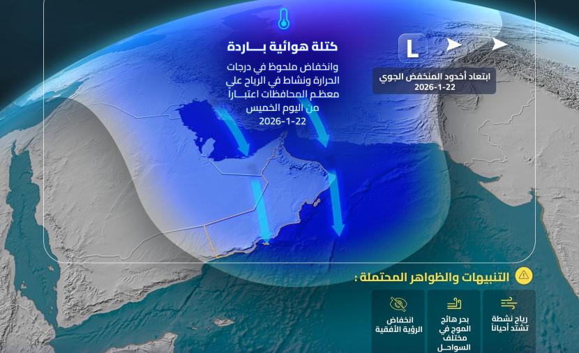 أعلنت الأرصاد العُمانية عن تأثر سلطنة عُمان بكتلة هوائية باردة مع نشاط للرياح، وذلك اعتبارًا من اليوم الخميس.