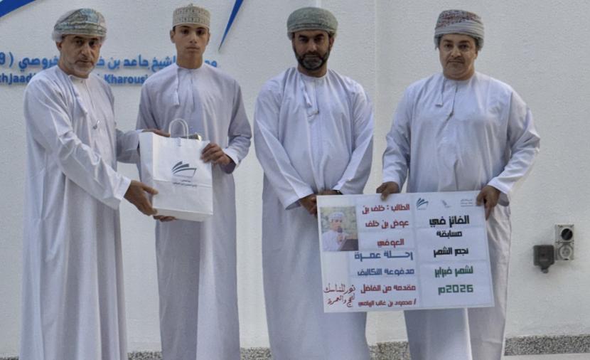 كرّمت مدرسة الشيخ جاعد بن خميس الخروصي للبنين (912) بولاية العوابي في محافظة جنوب الباطنة، الطالب خلف بن عوض بن خلف العوفي، برحلة إلى الديار المقدسة لأداء مناسك العمرة، مقدمة من نور المناسك للحج والعمرة شاملة التكاليف، وذلك بمناسبة فوزه في مسابقة نجم الشهر لشهر فبراير، كما قدمت المدرسة له هدية وذلك تقديراً لتفوّقه واجتهاده وتميّزه في مسيرته الدراسية.