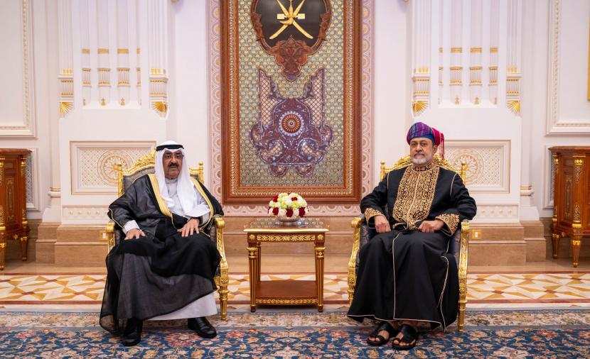 حضرةُ صاحبِ الجلالةِ السُّلطان هيثم بن طارق المعظم /حفظهُ اللهُ ورعاهُ/ في مقدّمة مستقبلي أخيه صاحب السُّمو الشيخ مشعل الأحمد الجابر الصباح أمير دولة الكويت لدى وصوله إلى مطار الدّقم بمحافظة الوسطى لحضور حفل افتتاح مصفاة الدّقم والصناعات البتروكيماوية، في إطار زيارة “دولة” يقوم بها سُموّه إلى سلطنة عُمان.