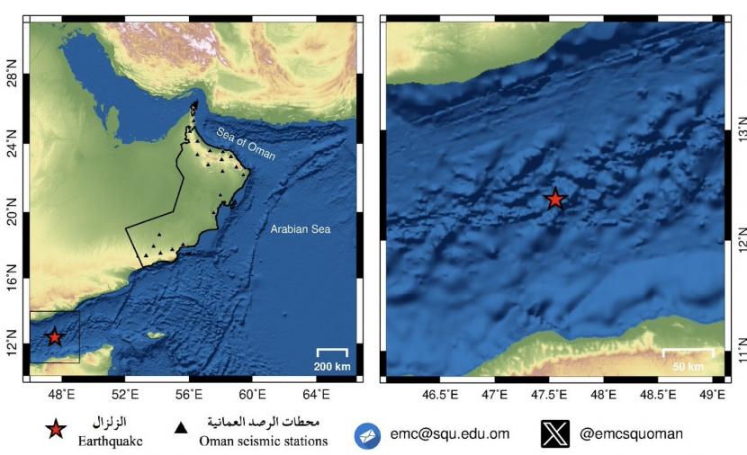 قال مركز رصد الزلازل بجامعة السلطان قابوس اليوم، إنه سجل هزة أرضية متوسطة في خليج عدن بقوة 5.7 على مقياس ريختر؛ حيث سجل الزلزال في تمام الساعة 11:31 صباحًا بالتوقيت المحلي .