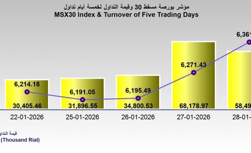 سجلت بورصة مسقط أداءً إيجابيًا في جلسة أمس الأربعاء؛ حيث أغلق مؤشر MSX30 عند مستوى 6361.45 نقطة، مرتفعا بمقدار 90.02 نقطة بنسبة 1.44%، مسجلًا بذلك أعلى مستوى خلال 5 أيام تداول متتالية، في مؤشر يعكس تحسن ثقة المستثمرين وعودة الزخم إلى السوق.