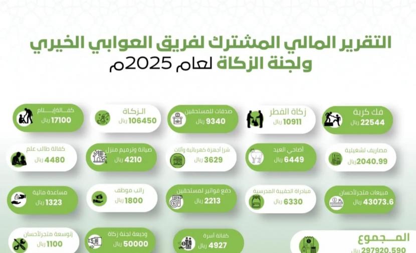 أصدر فريق العوابي الخيري بولاية العوابي التابع للجنة التنمية الاجتماعية، ولجنة الزكاة بولاية العوابي في محافظة جنوب الباطنة والتابعة لدائرة الزكاة بوزارة الأوقاف والشؤون الدينية، التقرير السنوي للمصروفات المشترك لعام 2025، بإجمالي نفقات297920.590 ريال عماني.