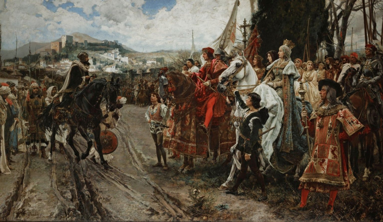 غير أنّه لا حضارة خالدة. ففي أواخر القرن الخامس عشر، تعاظمت حركة الاسترداد المسيحية (الريكونكويستا) في شبه الجزيرة الإيبيرية، ومع سقوط غرناطة عام 1492، أفسحت تلك الحقبة المشرقة المجال لظلام عميق. لم يكن ذلك سقوط مدينة فحسب، بل انهيار حضارة بأكملها. ومن أكثر الأعمال الفنية تجسيدًا لهذه اللحظة المأساوية لوحة الفنان فرانسيسكو براديّا إي أورتيث الشهيرة تسليم غرناطة. ففي اللوحة يظهر آخر أمراء غرناطة، أبو عبد الله الصغير، على صهوة جواد أسود، يحمل مفاتيح المدينة بين يديه. في عينيه وداع حزين لحضارة عمرها ألف عام، وعلى كتفيه ثقل التاريخ. وأمامه يقف الملك والملكة الكاثوليكيان، في هيئة المنتصر القاسي. إنها لوحة لا ترسم الاستسلام، بل تصوّر صرخة صامتة.
