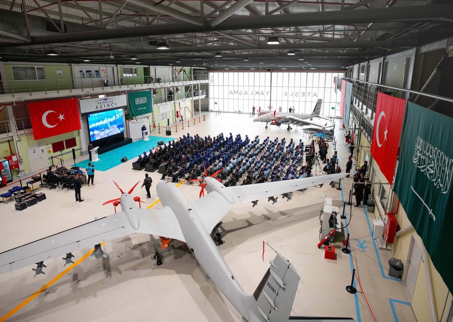 شهد قائد القوات الجوية السعودية، الفريق الركن تركي بن بندر بن عبدالعزيز، في قاعدة تشورلو الجوية بجمهورية تركيا، حفل تخريج الدفعة الأولى من متدربي القوات الجوية الملكية السعودية على منظومة الطائرات المسيَّرة من طراز «أقينجي»، التي تنتجها شركة «بايكار» التركية للصناعات الدفاعية.