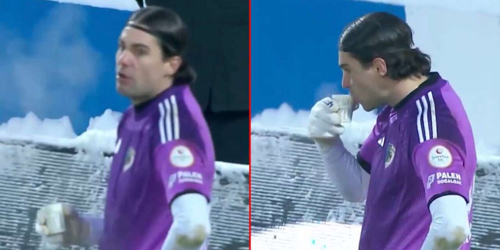 في لقطة طريفة وغير معتادة، تداول رواد مواقع التواصل الاجتماعي مشهداً لحارس مرمى نادي إيرزوروم سبور وهو يحتسي الشاي خلال إحدى مباريات دوري ترينديول للدرجة الأولى التركي، في محاولة للتدفئة من البرد القارس وسط تساقط كثيف للثلوج وانخفاض شديد في درجات الحرارة.