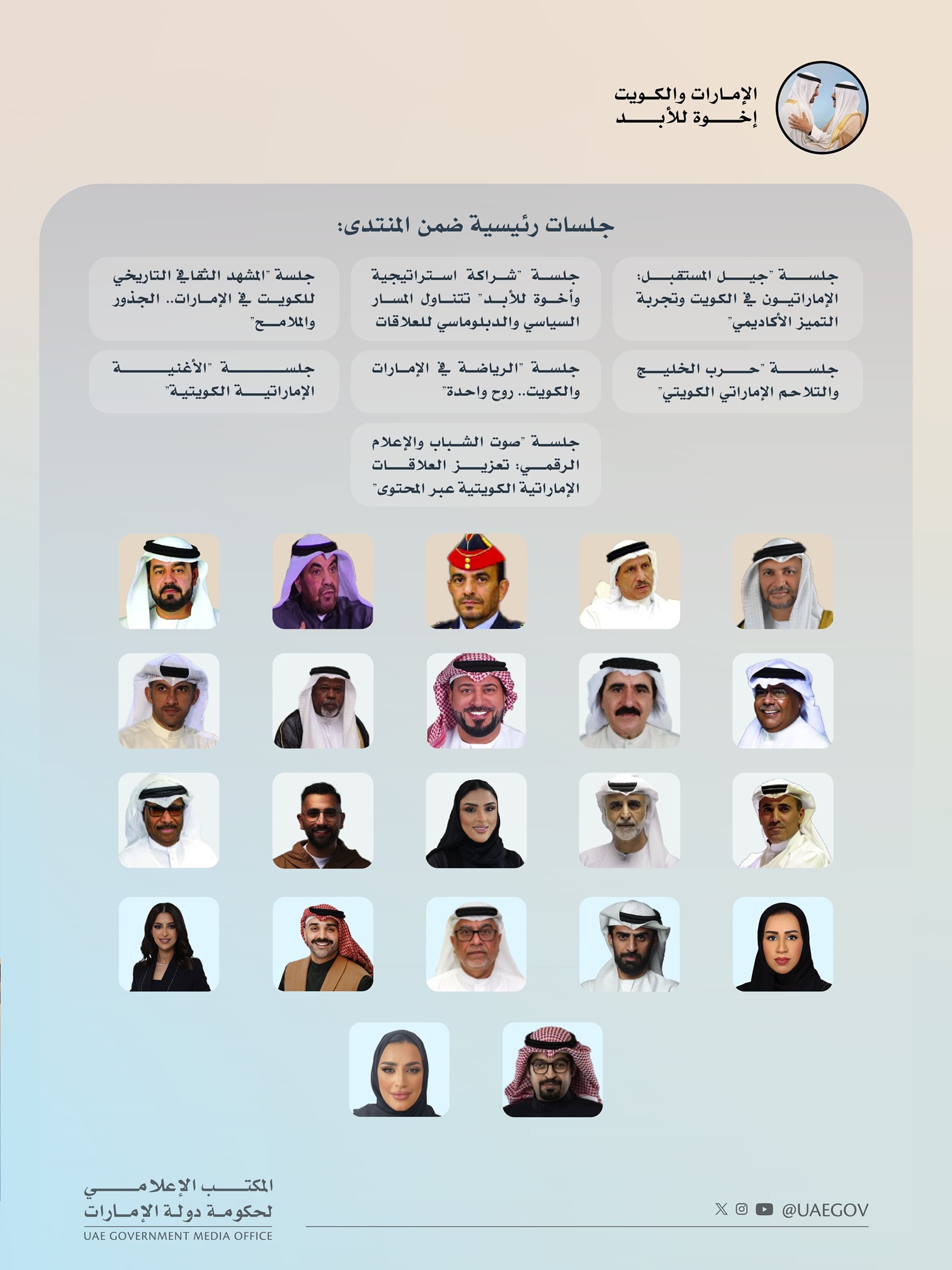تنفيذاً لتوجيهات القيادة الرشيدة بالاحتفاء بالعلاقات الأخوية الراسخة بين دولة الإمارات العربية المتحدة ودولة الكويت الشقيقة، ينطلق يوم الخميس المقبل “المنتدى الإعلامي الإماراتي الكويتي” ضمن فعاليات أسبوع “الإمارات والكويت.. إخوة للأبد” الذي يبدأ يوم 29 يناير الجاري ولمدة أسبوع في جميع إمارات الدولة.