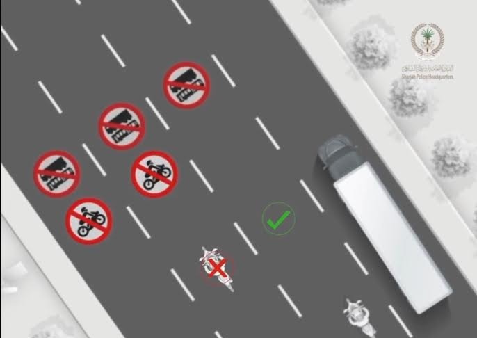 وأوضحت شرطة الشارقة بأن المسار الواقع جهة أقصى اليمين قد خصص لسير المركبات الثقيلة والحافلات على الطرق، في حين يُسمح للدراجات النارية باستخدام المسارين الثالث والرابع من جهة اليمين في حال كان الطريق مكوّن من أربع حارات، بينما يُسمح لها في الطرق المكوّنة من ثلاث حارات بالسير في المسار الأوسط أو الأيمن، وفق اللوائح المرورية المعتمدة، وفي حال وجود مسارين يسمح لها بالسير في الجهة اليمنى فقط.