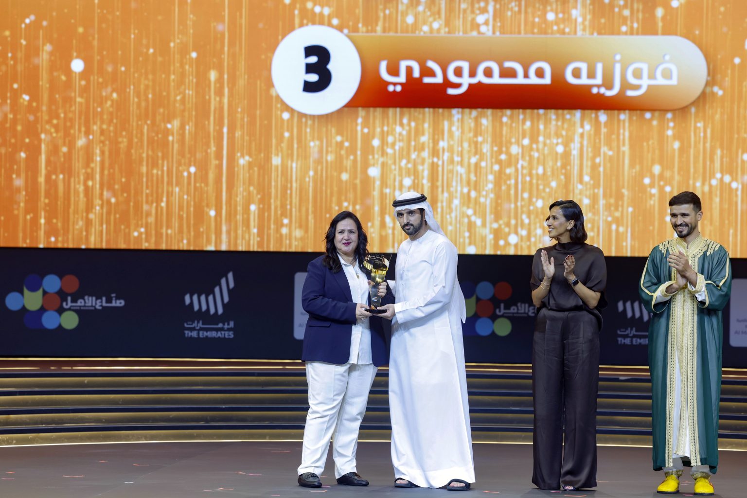 توّج سموّ الشيخ حمدان بن محمد بن راشد آل مكتوم ولي عهد دبي، نائب رئيس مجلس الوزراء وزير الدفاع، رئيس المجلس التنفيذي لإمارة دبي، بحضور سموّ الشيخ مكتوم بن محمد بن راشد آل مكتوم، النائب الأول لحاكم دبي، نائب رئيس مجلس الوزراء وزير المالية، وسموّ الشيخ أحمد بن محمد بن راشد آل مكتوم، النائب الثاني لحاكم دبي، اليوم (الأحد) فوزية جبارة محمودي من المملكة المغربية بلقب “صانعة الأمل الأولى” في الوطن العربي، ونالت مكافأة مالية بقيمة مليون درهم.