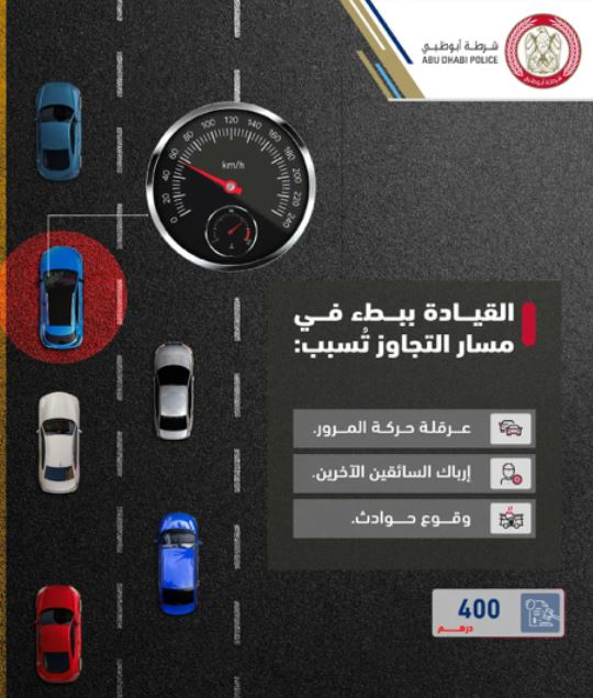 دعت شرطة أبوظبي السائقين إلى الالتزام بالمسار الأيمن عند القيادة بسرعات بطيئة لما تسببه من عرقلة في حركة السير وإرباك السائقين ووقوع حوادث أليمة ، موضحة أن مخالفة عدم إفساح الطريق للمركبات التي لها أفضلية القادمة من الخلف أو من جهة اليسار “مسار التجاوز ” قيمتها 400 درهم.