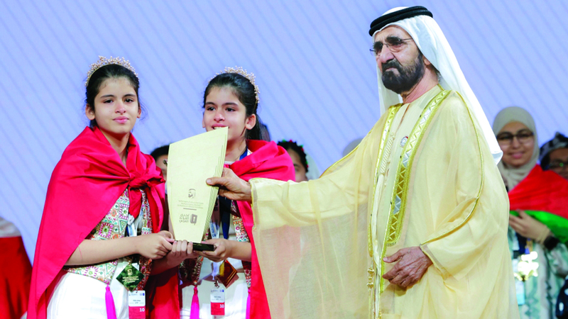 جاء ذلك لدى تكريم سموه، أصحاب المراكز الأولى في فئات تحدي القراءة العربي، خلال الحفل الختامي للدورة التاسعة الذي جرى في مركز دبي التجاري العالمي، أمس، حيث توَّج سموه التوأم بيسان وبيلسان كوكة من تونس بطلتين لتحدي القراءة العربي 2025 من بين أكثر من 32 مليون طالب وطالبة من 50 دولة، مثلوا 132112 مدرسة، وتحت إشراف 161004 مشرفين ومشرفات شاركوا في تصفيات الدورة التاسعة من التظاهرة القرائية الكبرى من نوعها باللغة العربية على مستوى العالم.