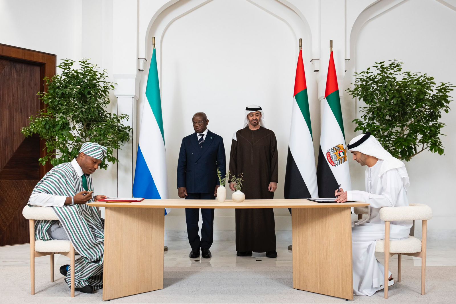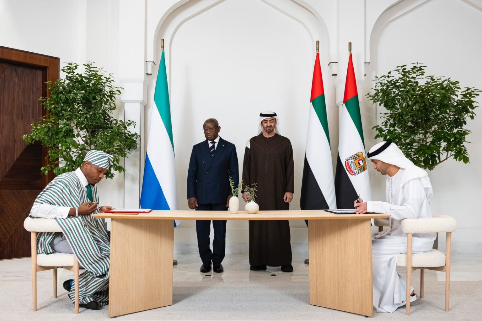 شهد صاحب السمو الشيخ محمد بن زايد آل نهيان، رئيس الدولة، حفظه الله، توقيع اتفاقية الشراكة الاقتصادية الشاملة مع رئيس جمهورية سيراليون جوليوس مادا بيو، في أبوظبي.