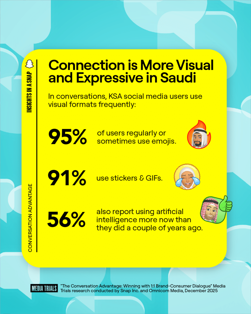 ويركز البحث على التحول في أساليب تواصل المستخدمين في المملكة، وكيف يمكن للعلامات التجارية التعامل مع بيئات المحادثات عبر قنوات مرئية وتعبيرية ومباشرة مثل الدردشة، مع الإشارة إلى اتساع حضور الصور ومقاطع الفيديو وأدوات التعبير المدعومة بالذكاء الاصطناعي في التواصل اليومي.