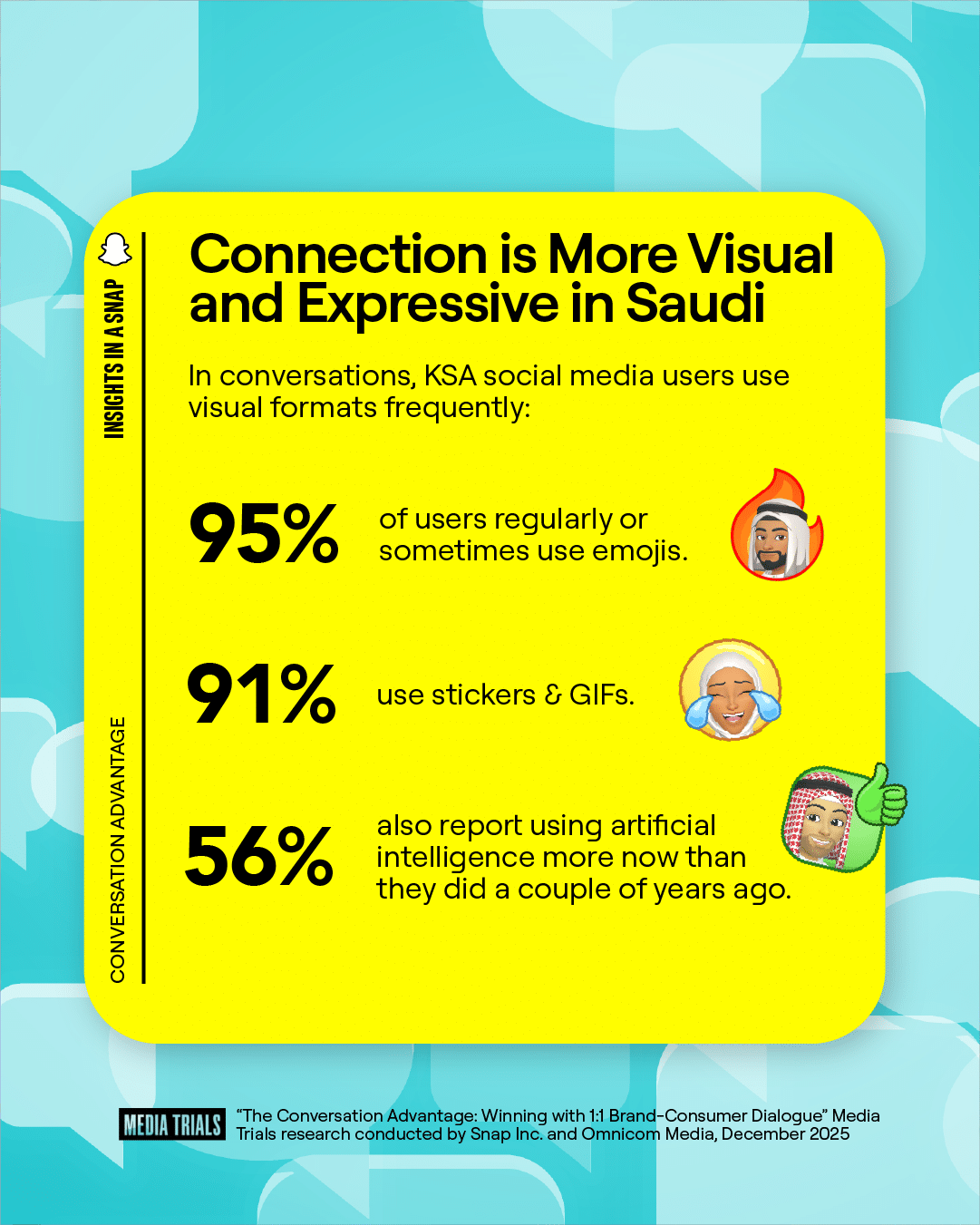 وبحسب النتائج، يرى أكثر من نصف مستخدمي وسائل التواصل الاجتماعي في المملكة أن مشاركة الصور أو مقاطع الفيديو داخل المحادثات الخاصة تُعد شكلًا من أشكال التواصل. كما أشار «معظم المستهلكين» إلى أن هذه الأشكال تساعدهم على التعبير عن مشاعرهم بوضوح أكبر، مع تزايد استخدام الذكاء الاصطناعي لإضافة لمسات إبداعية إلى الرسائل اليومية.