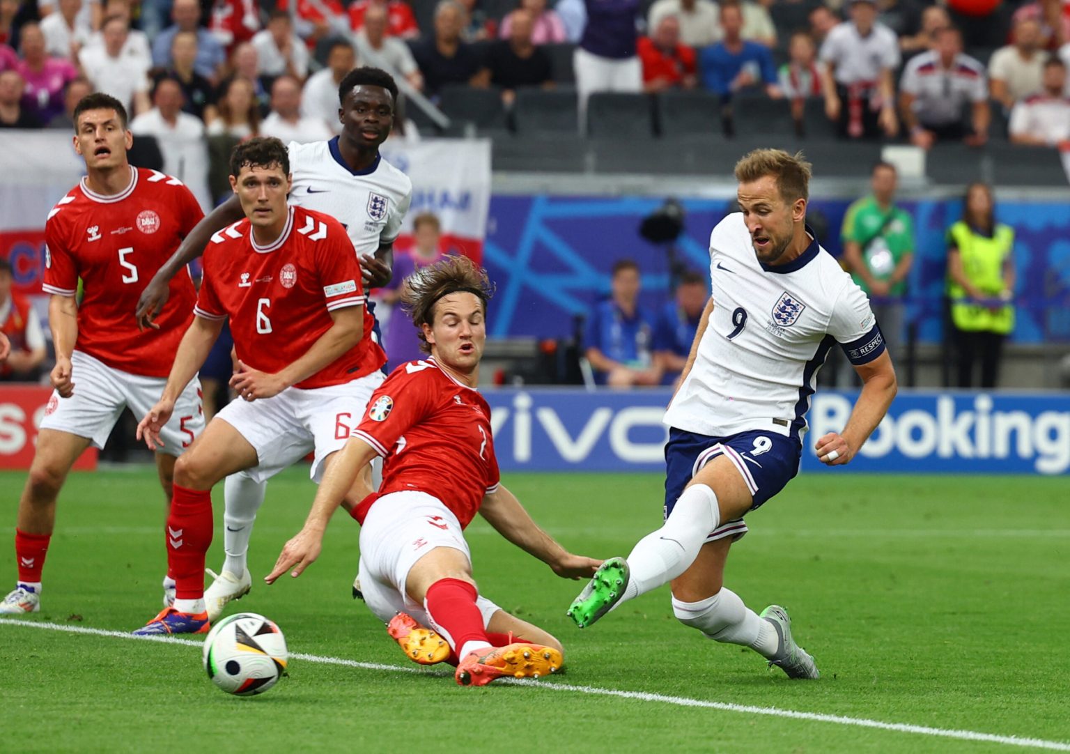 حيث تقدم هاري كين في الدقيقة 18 وفي الدقيقة 34 تعادل هيولماند لمنتخب الدنمارك .