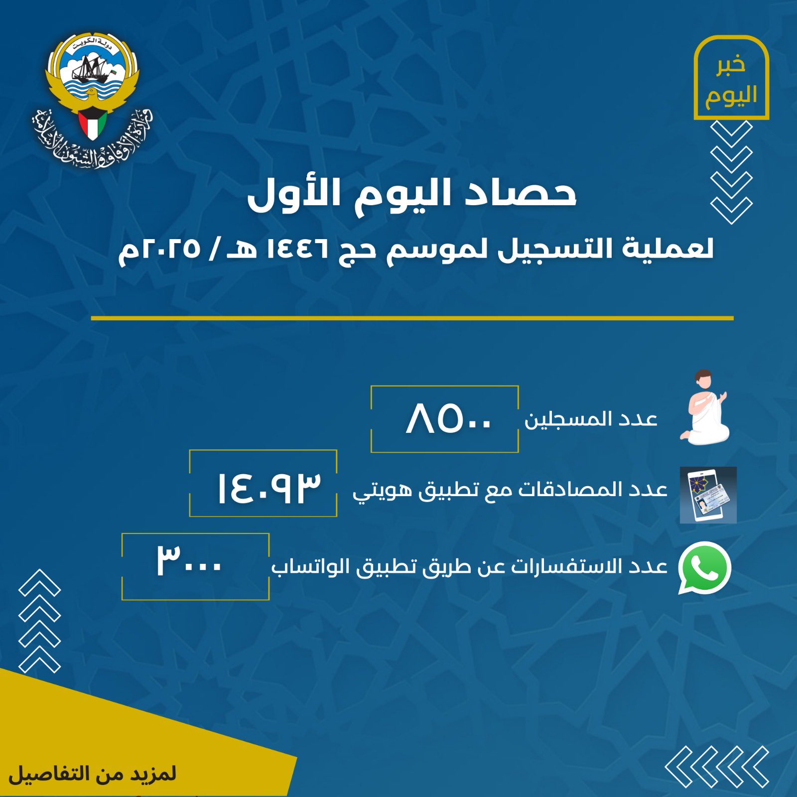 أعلنت وزارة الأوقاف والشؤون الإسلامية أن عدد المسجلين لموسم الحج المقبل في اليوم الأول لفتح باب التسجيل عبر المنصة الالكترونية بلغ 8500 مواطن، مضيفة أن عدد المصادقات عبر تطبيق “هويتي” للغرض ذاته بلغ 14093، فيما تم توجيه 3 آلاف استفسار عبر تطبيق الواتساب.