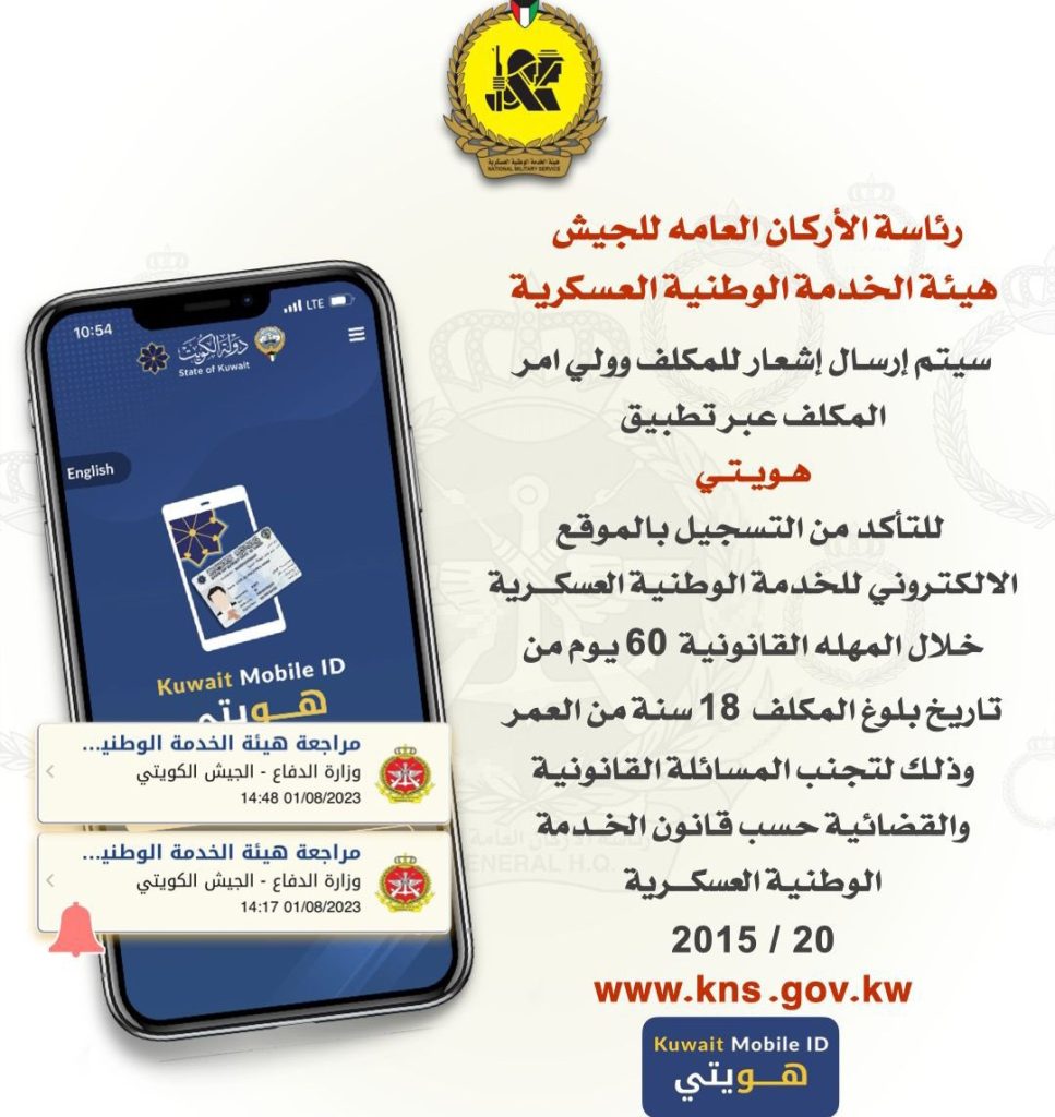 The post الخدمة الوطنية: إرسال إشعار للمكلف وولي أمر المكلف بالخدمة الوطنية العسكرية عبر هويتي first appeared on صحيفة إلكترونية كويتية شاملة مستقلة.