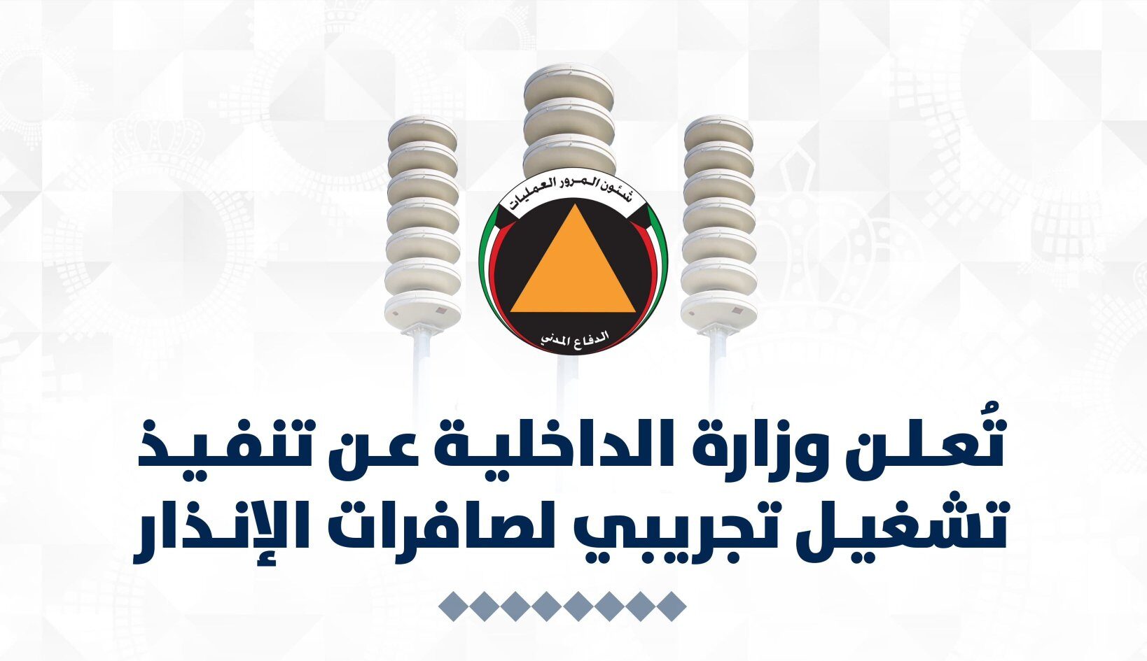 (كونا) أعلنت وزارة الداخلية اليوم الأربعاء عن تنفيذ تشغيل تجريبي لصافرات الإنذار يوم الاثنين 19 يناير الجاري وذلك في تمام الساعة العاشرة صباحا.