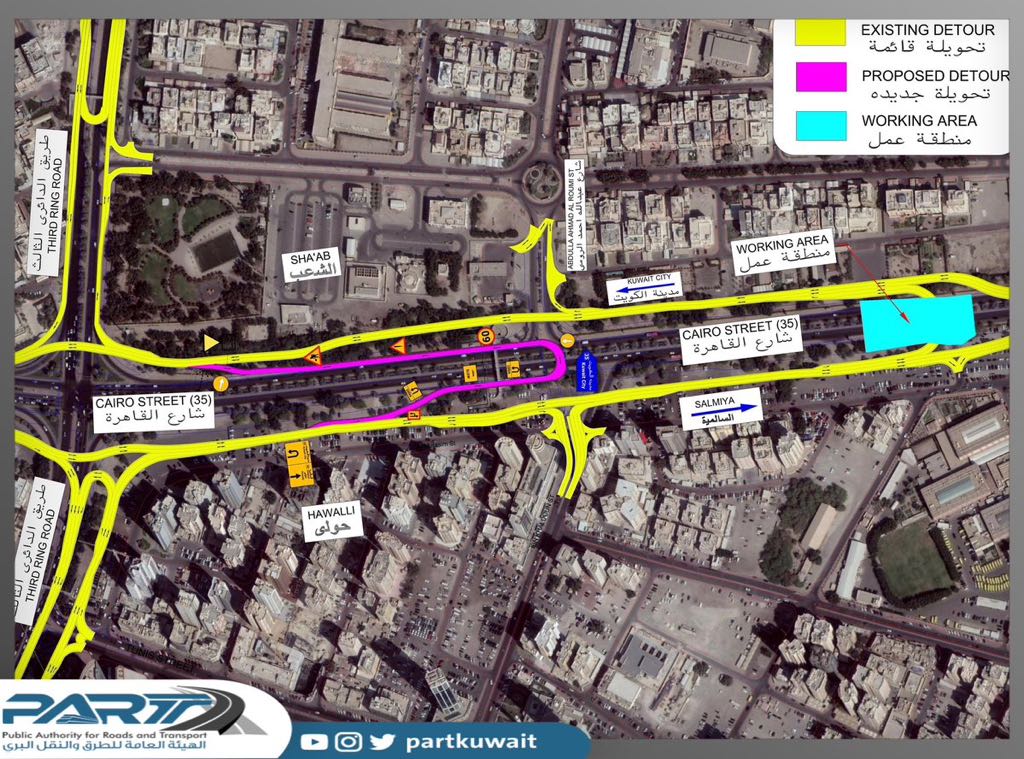 أعلنت الهيئة العامة للطرق والنقل البري، بالتعاون مع الإدارة العامة للمرور، عن نقل الالتفاف بين منطقتي الشعب وحولي طبقًا للمخطط المرفق، وذلك لاستكمال ربط الأعمال النهائية للمرحلة الأولى والثانية في المشروع، فجر يوم غد الاثنين.