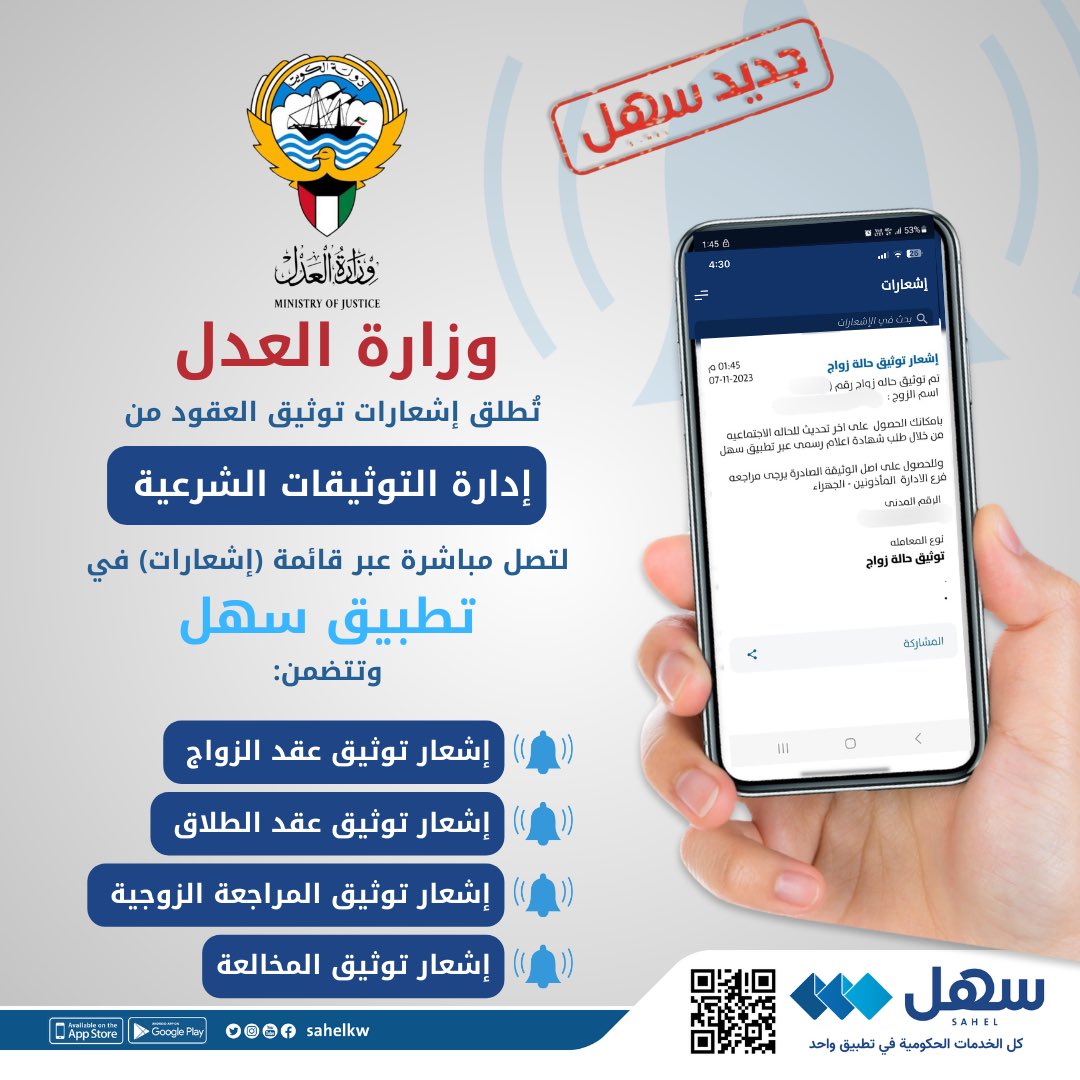 دشنت وزارة العدل إشعارات جديدة خاصة بتوثيق العقود من إدارة التوثيقات الشرعية عبر التطبيق الحكومي الموحد للخدمات الإلكترونية «سهل».