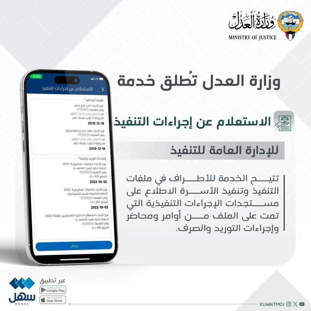 وتتيح الخدمة للأطراف في ملفات التنفيذ وتنفيذ الأسرة الاطلاع على مستجدات الإجراءات التنفيذية التي تمت على الملف من أوامر ومحاضر وإجراءات التوريد والصرف. وفق ما نشرته «العدل» عبر حسابها في منصة «إكس».