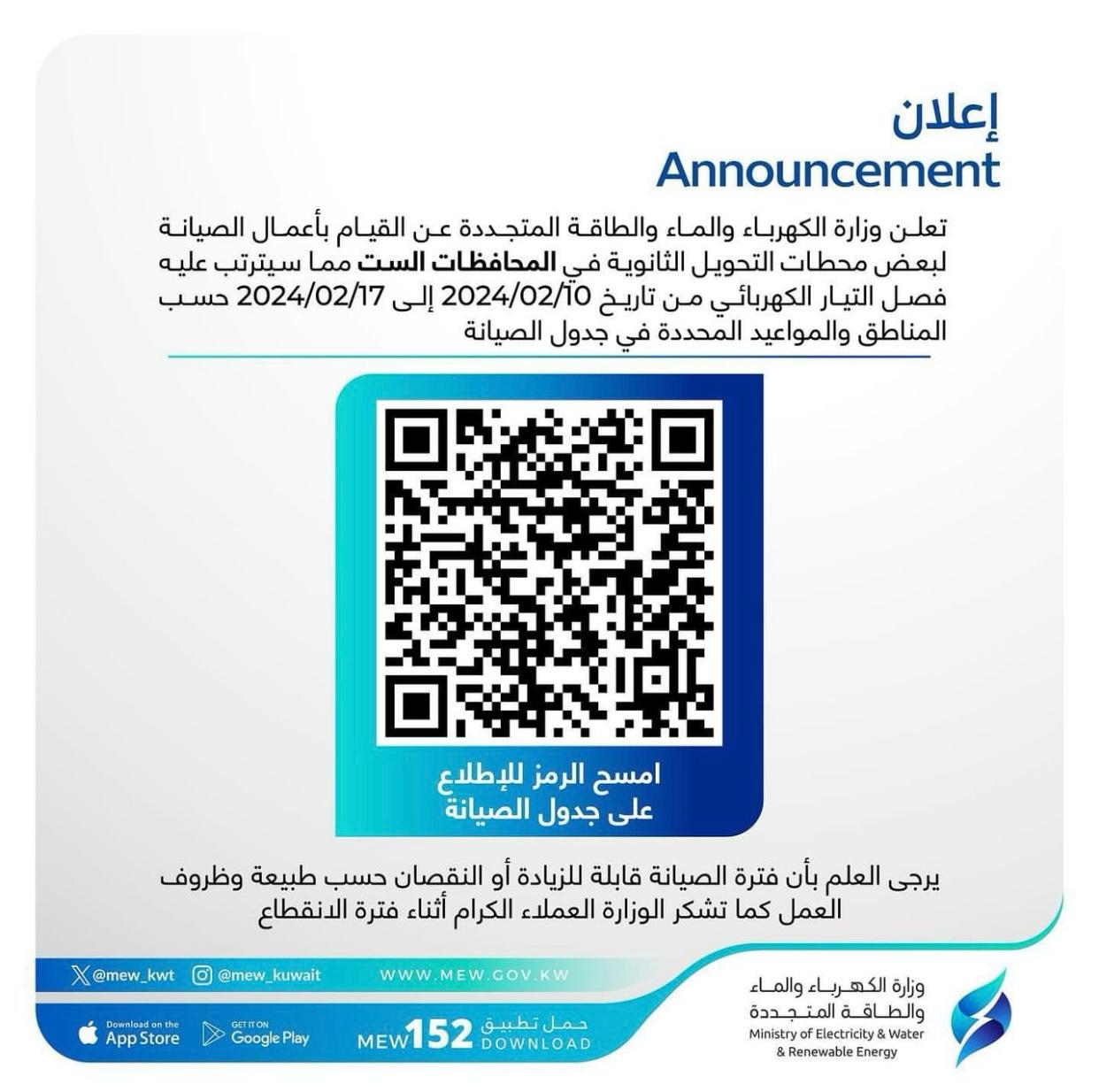 وقالت الوزارة إنه يرجى العلم بأن فترة الصيانة قابلة للزيادة أو النقصان حسب طبيعة وظروف العمل.