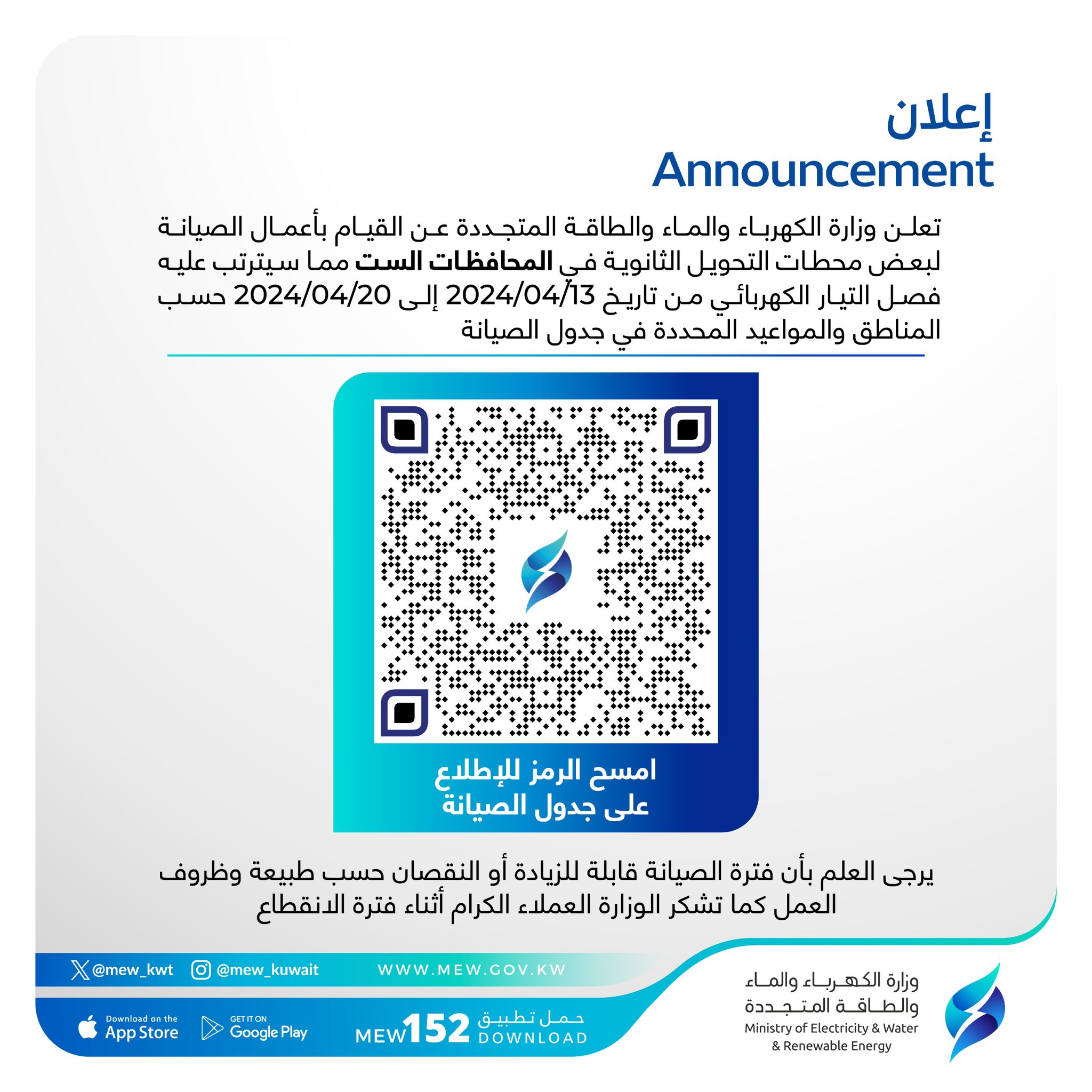 وقالت الوزارة إنه يرجى العلم بأن فترة الصيانة قابلة للزيادة أو النقصان حسب طبيعة وظروف العمل كما تشكر الوزارة العملاء الكرام أثناء فترة الانقطاع.