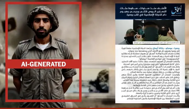بعد 4 أيام من هجوم “داعش” على حفل موسيقي في روسيا في مارس الماضي، جرى تداول مقطع فيديو مدته 92 ثانية على منصة خاصة تابعة للتنظيم الإرهابي، يظهر مذيع أخبار يرتدي خوذة وزياً عسكرياً ويقول إن الهجوم كان جزءا من “السياق الطبيعي للحرب المشتعلة بين التنظيم والدول التي تحارب الإسلام يحسب ما أورده تقرير نشر في “واشنطن بوست”.