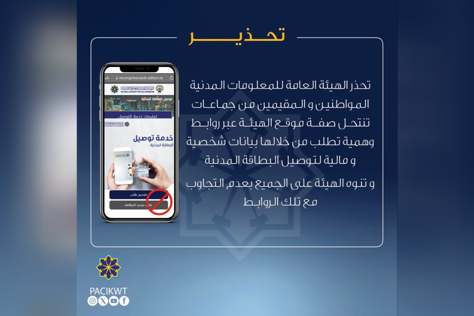 حذرت الهيئـة العامـة للمعلومـات المدنيـة المواطنين والمقيمين من جماعات تنتحل صفة موقع الهيئـة عبر روابط وهمية تطلب من خلالها بيانات شخصية و مالية لتوصيل البطاقة المدنية.