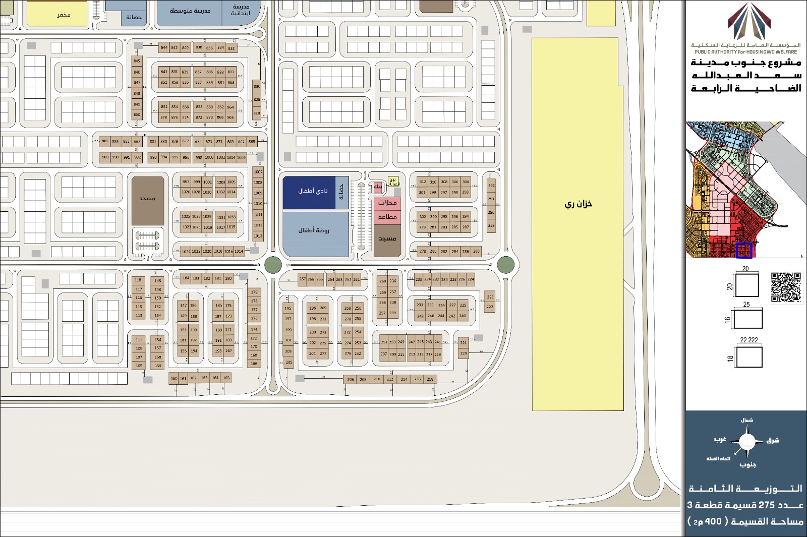 أعلنت المؤسسة العامة للرعاية السـكنية، عن قيامها بتوزيع الدفعة الثامنة من (N4) في القسائم الحكومية في مشروع جنوب مدينة سعد العبدالله والتي تشتمل على 275 قسيمه بمساحة 400 م2 للمخصص لهم حتى تاريخ11/10/2003.
