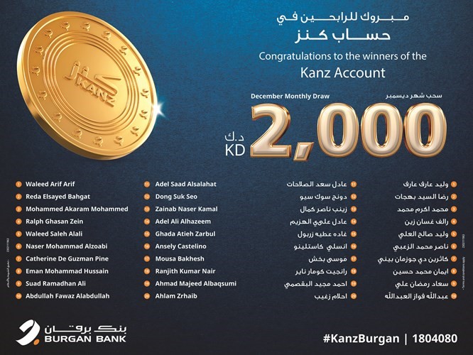 أعلن بنك برقان عن أسماء العشرين فائزا في السحب الشهري لحساب كنز، والذين سيحصل كل منهم على جائزة نقدية بقيمة 2000 دينار، ويدخل هذا السحب كل عملاء حساب كنز الذين يحافظون على رصيد أدنى قدره 200 دينار لمدة أسبوع على الأقل قبل تاريخ السحب، وتزداد فرصهم في الفوز كلما ازدادت إيداعاتهم في الحساب، وفيما يلي أسماء الفائزين: