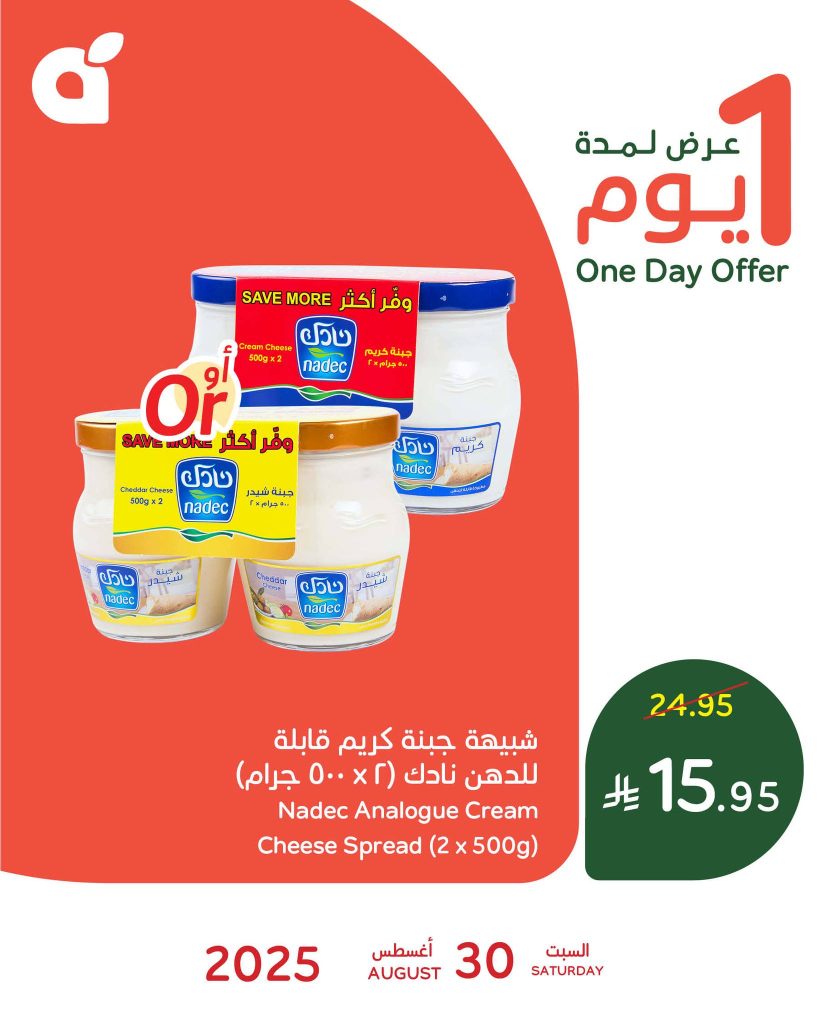 - جبنة شيدر قابلة للدهن نادك (2 × 500 جم) – 15.95 ريال (بدلًا من 24.95)