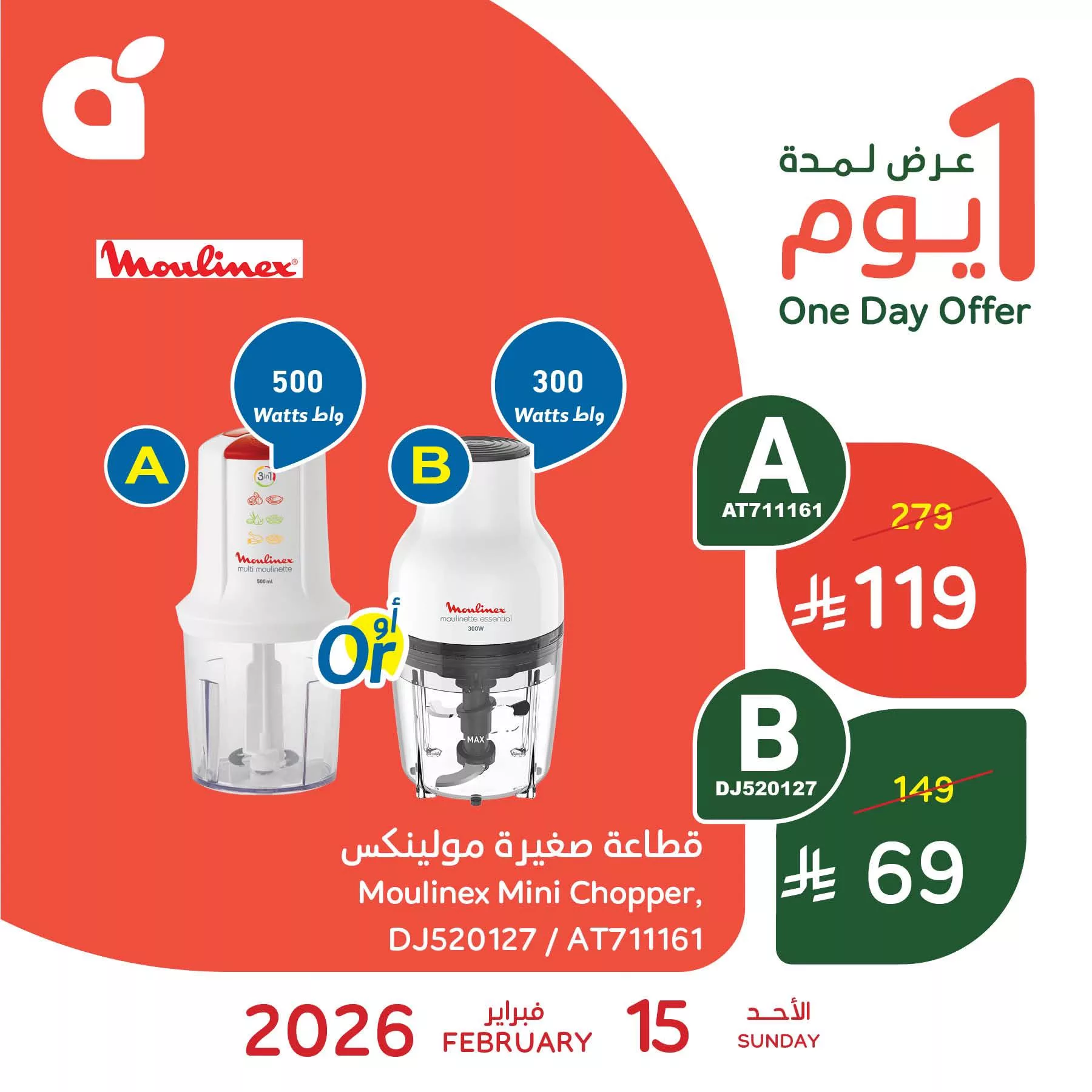 نقدم لكم اليوم احدث عروض بنده الاحد 15-2-2026 الموافق 27 شعبان 1447هـ و تحتوي اليوم علي افضل عروض الاجهزة المنزلية و هي قطاعة مولينيكس صغيرة في عرض حصري باسعار مميزة متاح اليوم فقط .