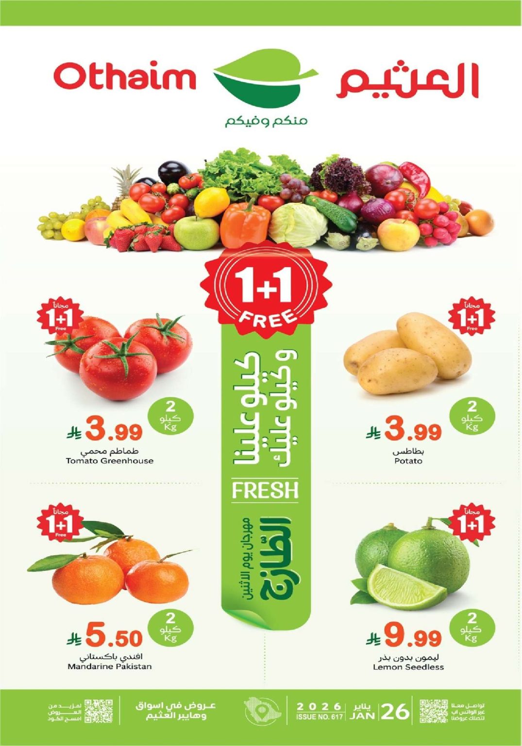 بنقدم ليكم احدث عروض العثيم الطازج الاثنين 26-1-2026 الموافق 7 شعبان 1447هـ و بتحتوي علي تشكيلة من الخضروات و الفواكه الطازجة كما تقدم عروض العثيم اليوم تشكيلة من المنتجات الغذائية و التوابل والاجبان المشكلة بجانب اجهزة المطبخ و اشهي اللحوم و باقل الاسعار مع عرض 1+1 مجانا متاح اليوم فقط