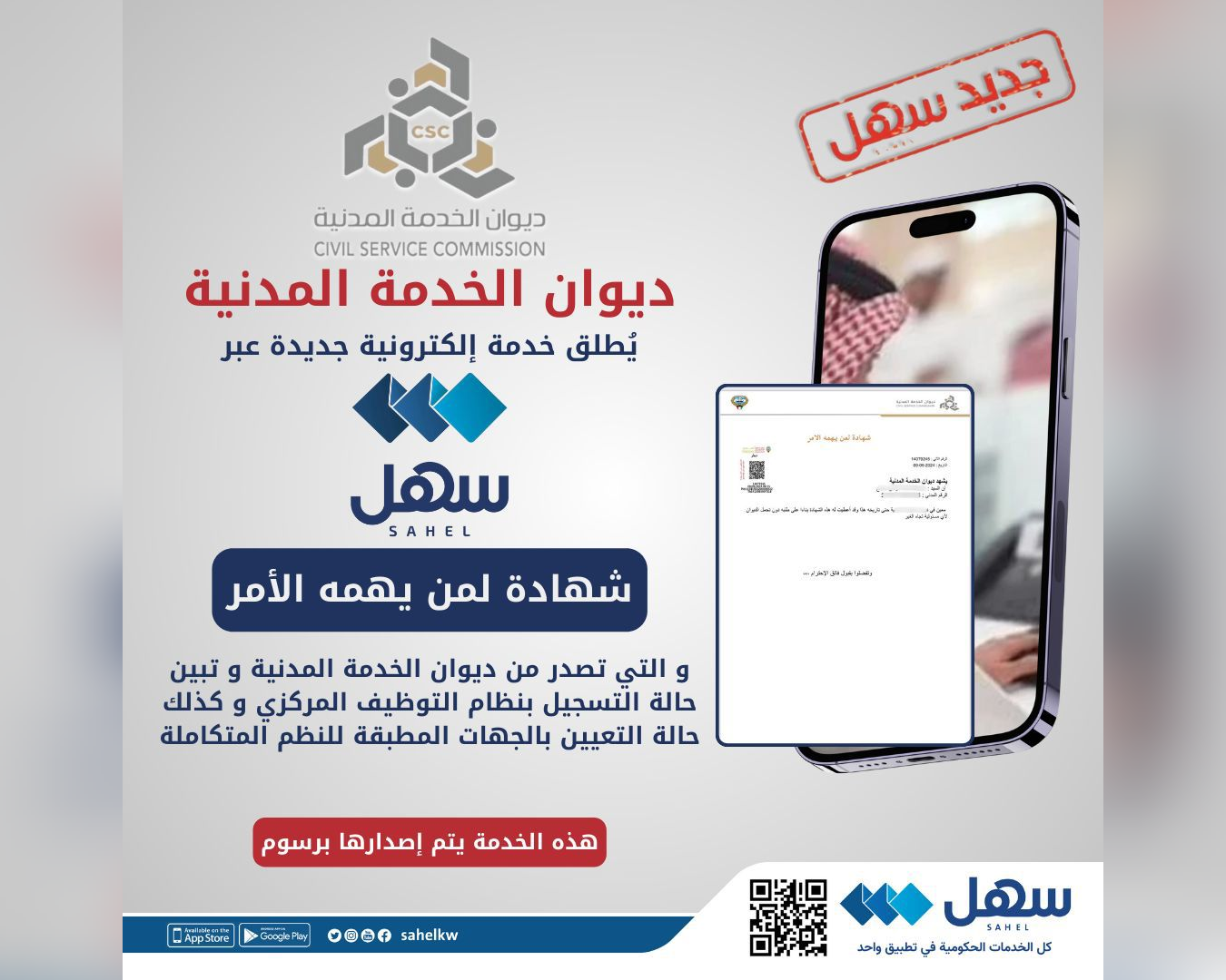 أعلن ديوان الخدمة المدنية اليوم الأحد إطلاق خدمة إلكترونية جديدة، وهي إمكانية اصدار شهادة «لمن يهمه الامر» عبر تطبيق «سهل».